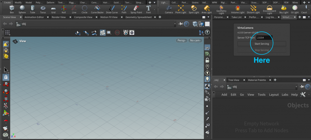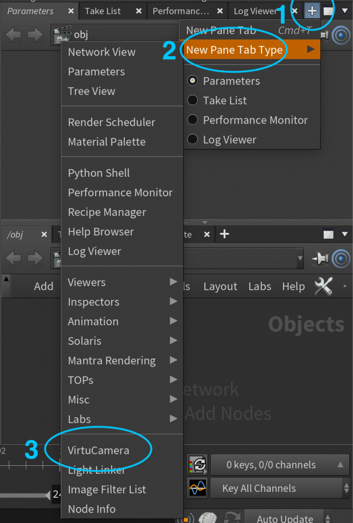 6. Open Houdini, in the parameters window, press the plus button to open a new tab, then press New Pane Tab Type and then press Virtucamera: