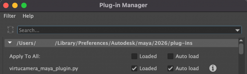 4. Open Maya, go to menu Windows > Settings/Preferences > Plug-in Manager and make sure virtucamera_maya_plugin.py is loaded.